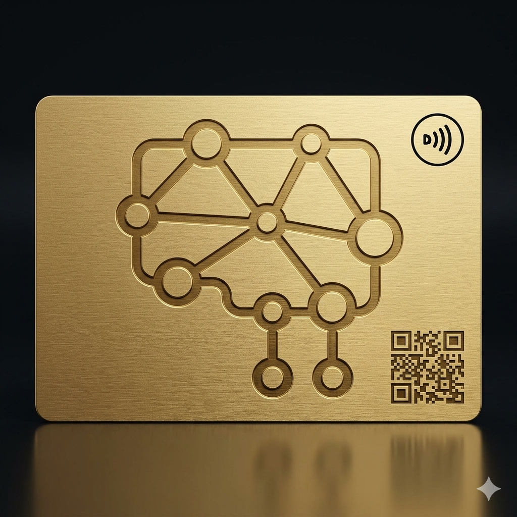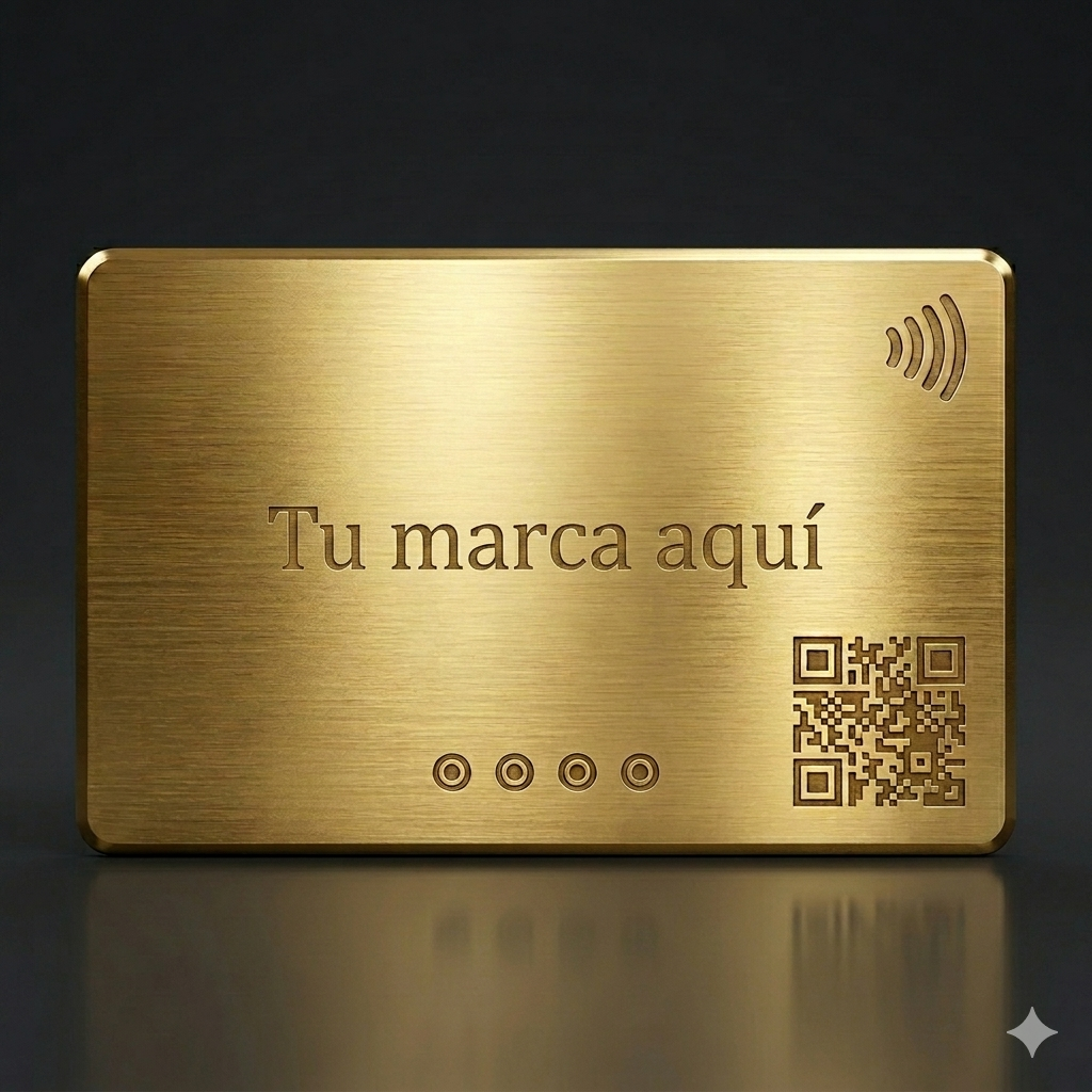Metal dorado con grabado láser, NFC y QR. Un toque y tu perfil completo llega al instante — contacto, redes, portafolio y catálogo. No compartes un número. Compartes tu mundo digital completo, siempre actualizado, sin cambiar la tarjeta. Para quienes no pasan desapercibidos.